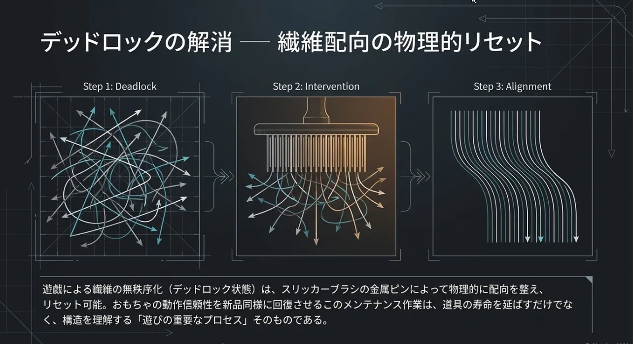 物理的な「糸」を再現したDIYモデルや、高度なギミックを持つ納豆おもちゃにつきものなのが、繊維の絡まりによる「デッドロック(動作停止)」です。特にポリエステル毛糸を使用したギミックは、摩擦によって繊維の端点がランダムに結合し、解けない塊になることがあります。