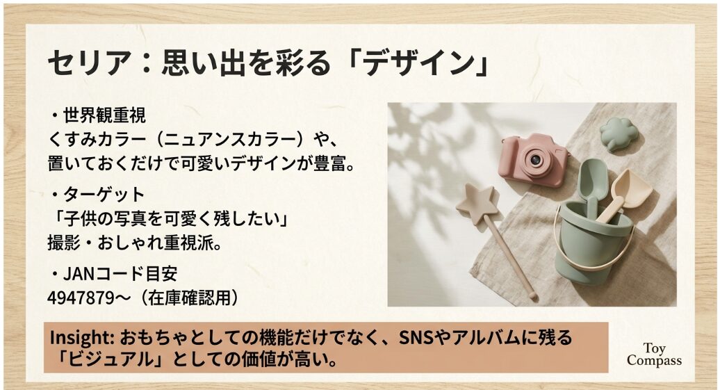 一方のセリアは、くすみカラーの砂場道具や、恐竜の形の砂型など、とにかく「写真映え」するアイテムが豊富です。