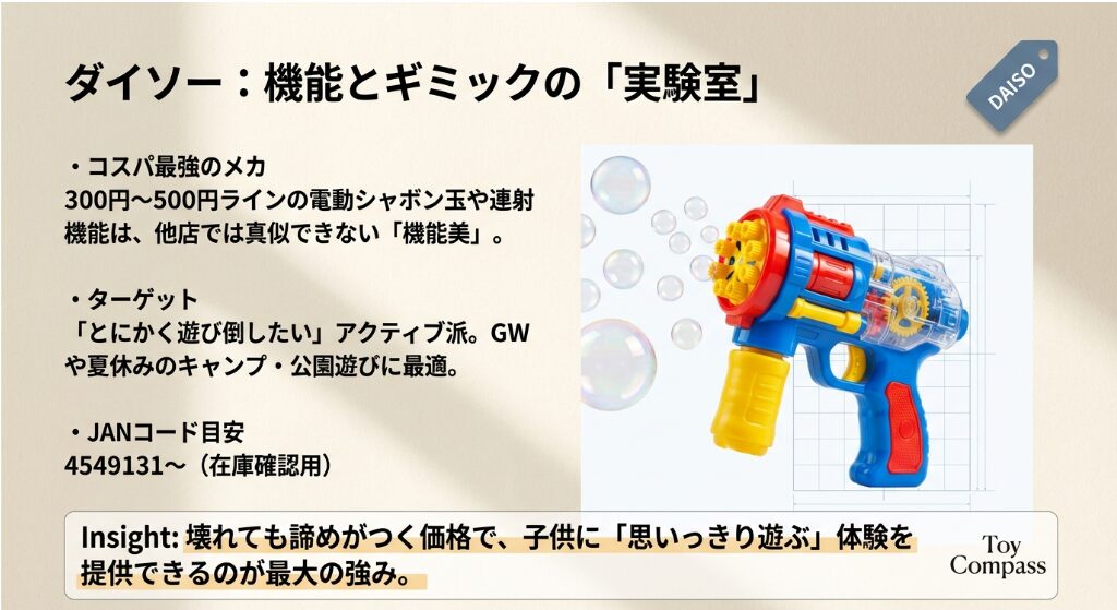 | ダイソー | 季節もの・行楽・玩具 | 3歳以上〜(※1) | 4549131〜等 | ★★★★★(圧倒的種類) |