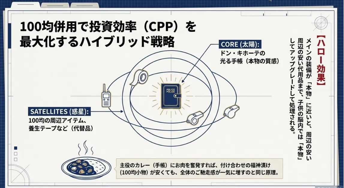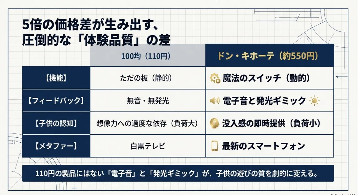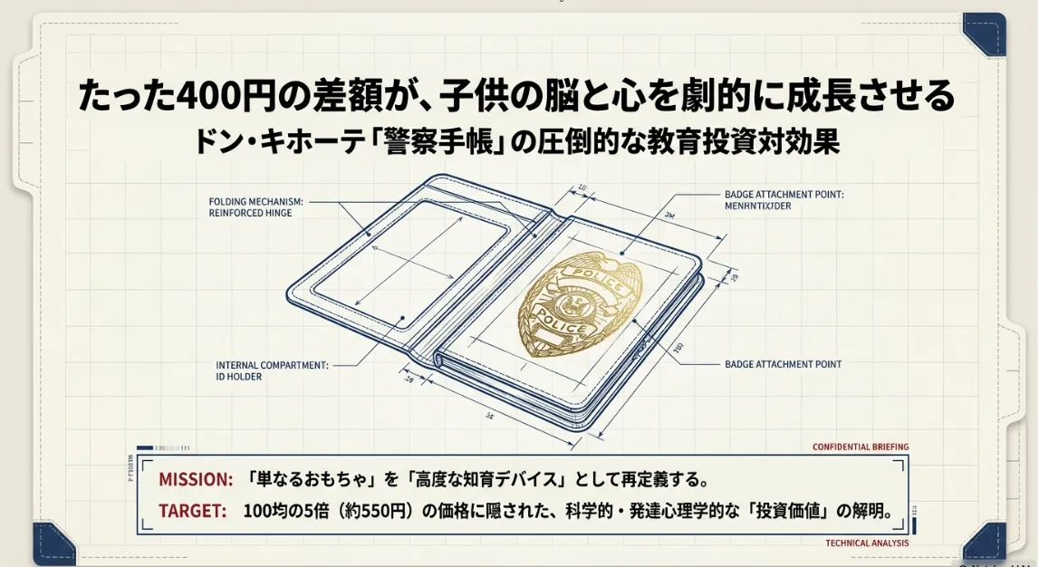 家計を守るママ・パパにとって、初期費用の安さは魅力ですが、知育の視点では「どれだけ長く、深く遊べるか」というプレイ時間あたりのコスト(CPP)を考えるのが正解です。100均の警察手帳は、音が鳴らないため子供が自分の想像力だけで楽しさを維持しなければならず、平均して数分で飽きてしまう傾向があります。一方で、ドン・キホーテの500円圏の製品は、ボタンを押すたびに新しい刺激(光と音)が得られるため、没入時間が100均製品の3倍以上になることも珍しくありません。