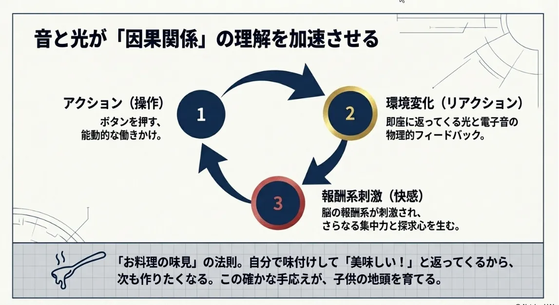 幼少期の子供にとって、「自分が何かをしたら、環境が変化した」という体験は、知的好奇心の根源です。ボタンを押す(原因)と、音が鳴り光る(結果)。このシンプルで強力なフィードバックが繰り返されることで、子供の脳内では物事のつながりを理解する回路が強化されると考えられています。