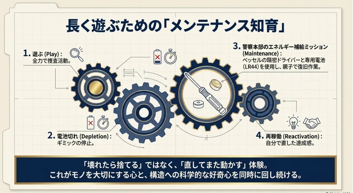 また、ボタン電池(LR44など)は連打すると消耗が激しいものです。ここで一つ、知育的なルールを提案します。「この手帳のエネルギーは、警察本部(パパ・ママ)でしか補給できない特別なもの」という物語を共有するのです。無意味な連打を抑える自己抑制能力を育みながら、お手伝いや約束を守った時の「ご褒美」として電池交換を位置づけることで、おもちゃを教育的なツールへと昇華させることができます。