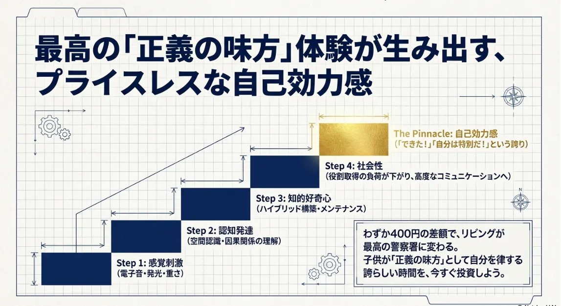 光るバッジを掲げることで、子供は「自分は今、正義の味方なんだ」というメタ認知(客観的に自分を見る力)を強め、より高度なストーリーを組み立てるようになります。これが、単なるおもちゃ選びを超えた「教育投資」としての価値なのです。