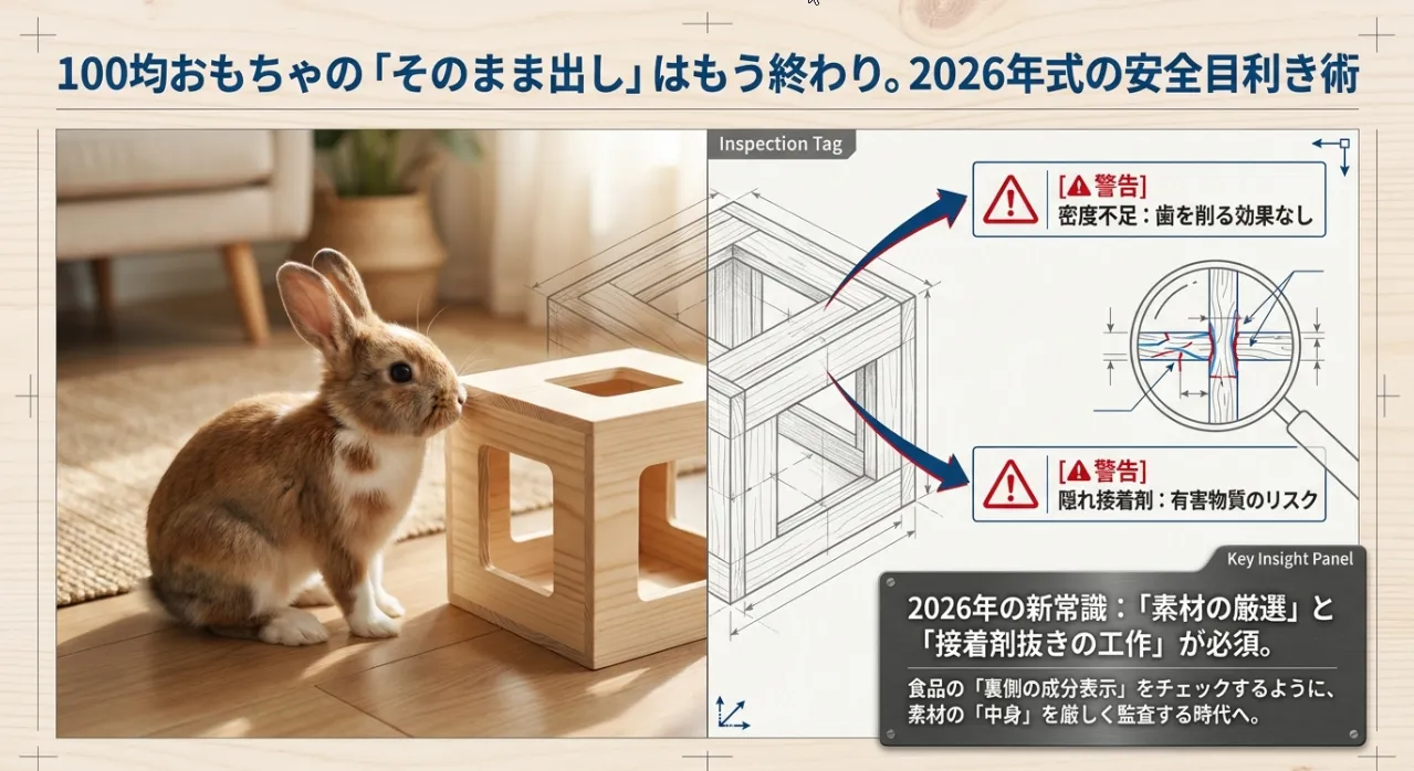 でも、2026年現在の材料工学や毒性学の視点で100均製品を厳格に査定すると、そこには「安さ」と引き換えにした、うさぎの健康を脅かす大きなリスクが隠れていることがわかってきました。特に、うさぎ特有の強靭な歯に対して100均の木材がいかに無力か、そして安価な接着剤が体内でどう作用するかを知ることは、大切な家族を守るための第一歩です。