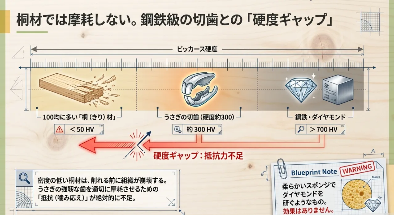 | 比較項目 | うさぎの切歯(エナメル質) | 100均の桐(きり)材 |
