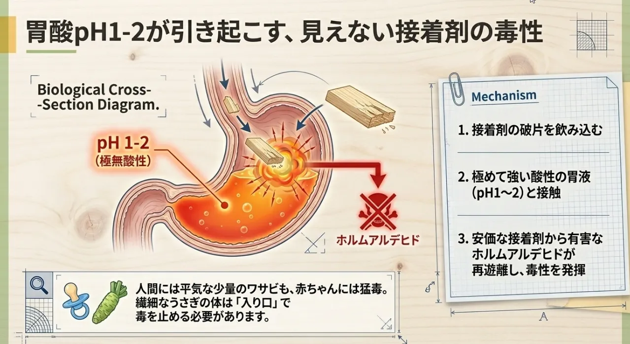 うさぎの胃の中は、非常に強い酸性(pH 1〜2程度)に保たれています。噛み砕かれた接着剤の破片がこの強酸にさらされると、化学反応によってホルムアルデヒドの再遊離が促進されると考えられています。つまり、飲み込んだ後に体内で毒素が活性化し、胃の粘膜を傷つけたり全身に悪影響を及ぼしたりするリスクがあるのです。