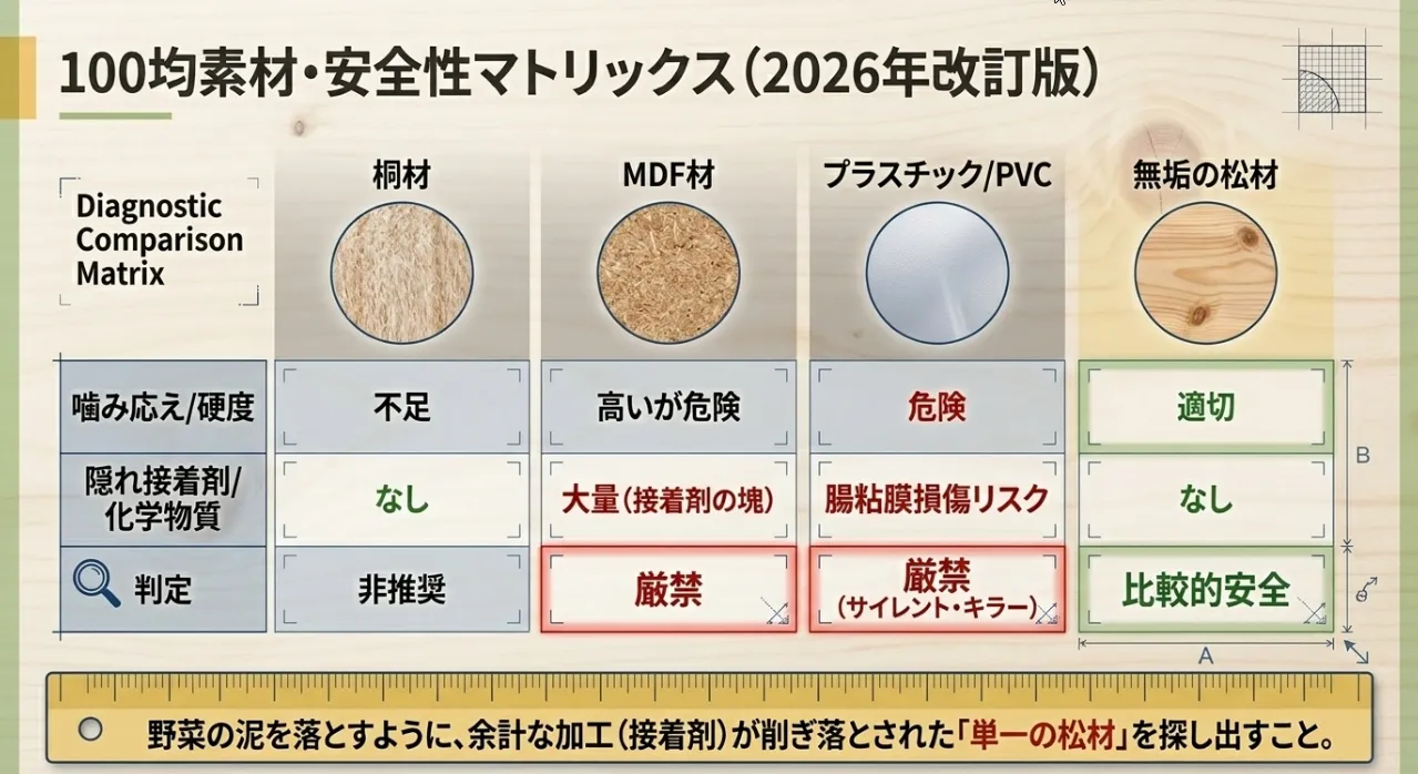100均の木箱は柔らかすぎて歯が削れず、むしろ有害な接着剤を摂取するリスクが高いからです。安全に遊ぶなら「素材の厳選」と「接着剤抜きの工作」が2026年の新常識ですよ。