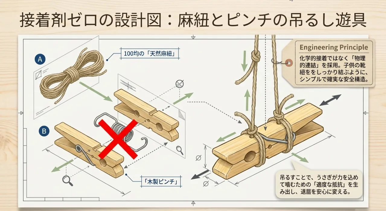 接着剤ゼロの物理工作!麻紐と木製ピンチの安全連結ハック