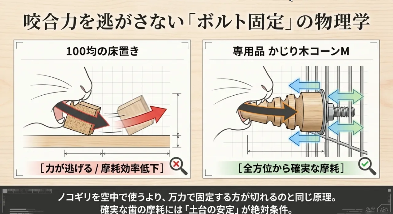 | 【攻め】歯を確実に削る | 川井 かじり木コーン M | ボルト固定で「逃げ」を封じ、全方位から切歯に摩擦を転嫁できる設計。 |