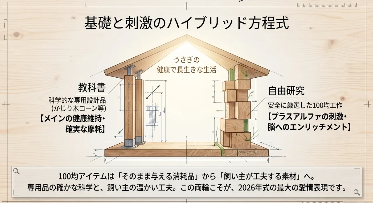専用品の最大のアドバンテージは、ケージに「ボルトで固定できる」点にあります。100均工作ではどうしても素材が動いてしまい、うさぎの最大咬合力が木材の破壊に効率よく伝わらないことがあります。専用品をベースに使いつつ、100均の麻紐工作を「気分転換の遊び」として組み合わせるのが、2026年式の最も賢い飼い方といえるでしょう。