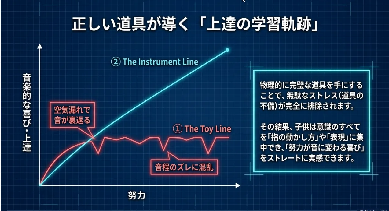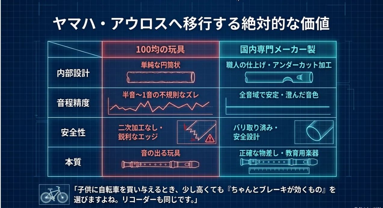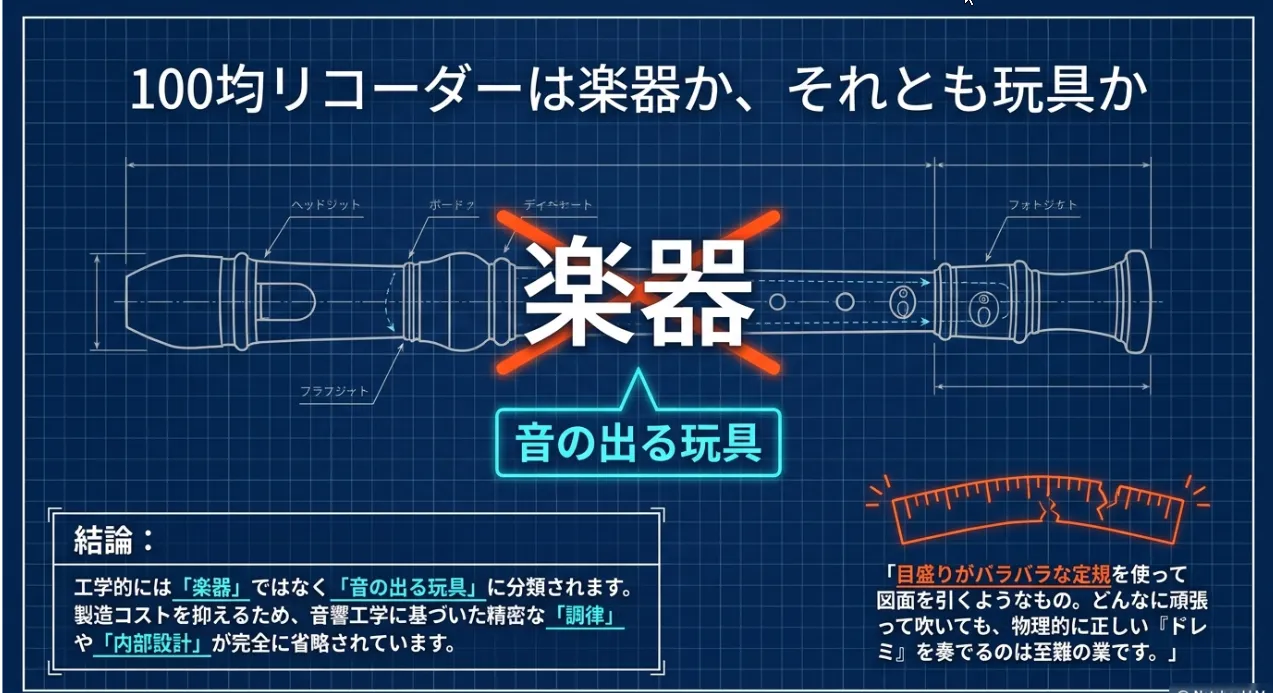 今回の調査と物理的な解析を通じて、100均のリコーダーは気柱共鳴の安定度、トーンホールの密閉精度、流体制御のいずれの点においても、楽器としての基準を満たしていないことが明確になりました。これは決して「100均が悪い」ということではなく、100円という物理的な価格限界の中で「楽器の精密さ」を担保することが不可能である、というシンプルな事実です。
