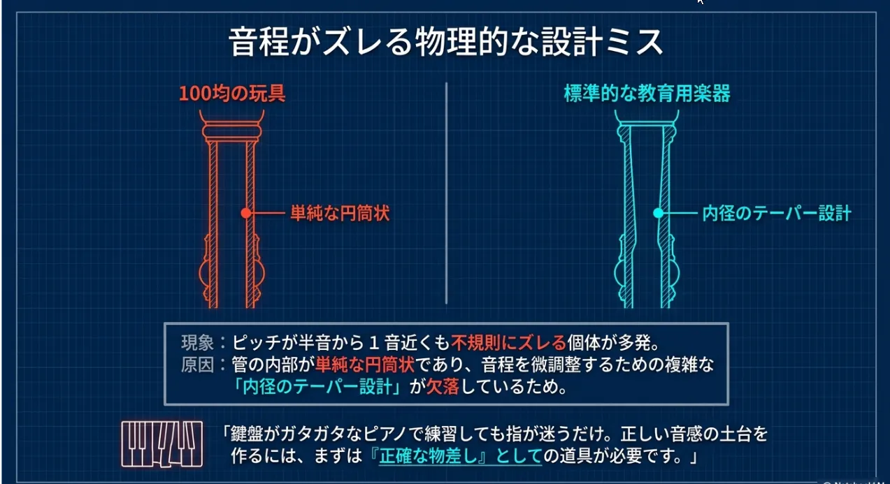 100均製品は標準的な音程から50〜100セント(半音〜全音近く)も逸脱することが珍しくありません。一人での練習ですら「正しい音感」を損なうリスクがあると考えられています。