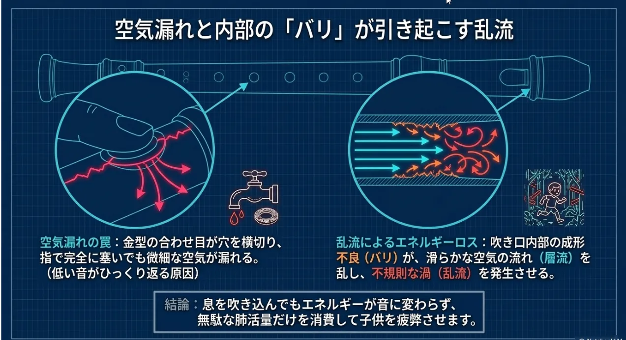 流体力学の観点から言えば、この微細な漏気(リーク)は、管内の圧力を著しく低下させます。特に全部の穴を塞ぐ「低いド」の音が鳴りづらい、あるいは音がひっくり返る(オーバーブロー)現象は、この漏気による音響損失が原因である可能性が高いと言えます。100円というコスト制限の中では、精密なバリ取り作業などの二次加工が物理的に不可能なため、このような欠陥が放置されたまま店頭に並ぶことになるのです。