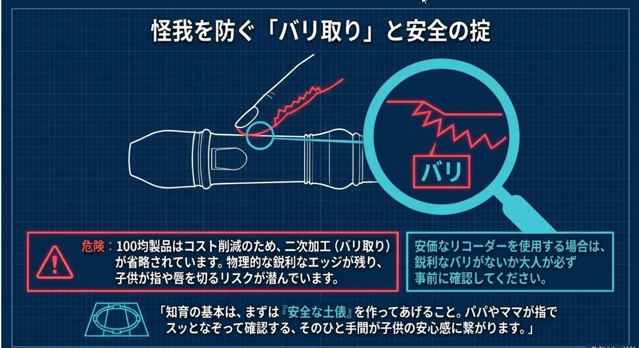 100均リコーダーを扱う上で、性能以上に注意すべきは「安全性」です。特に未処理のバリは、思わぬ裂傷の原因となることがあります。また、2026年現在はプラスチック資源のリサイクル意識も高まっているため、正しい処分方法を知っておくことも大切です。