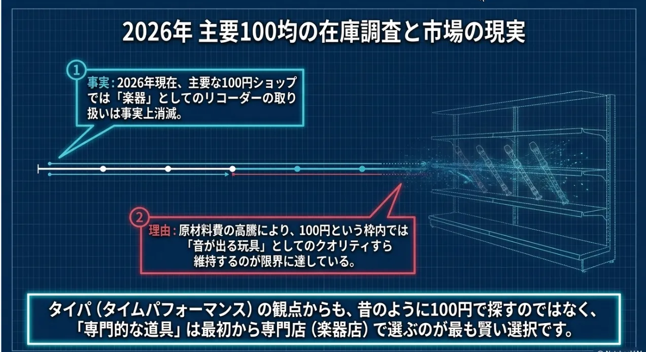 2026年現在の流通状況を調査したところ、100円均一ショップにおけるリコーダーの扱いは、数年前よりもさらに「玩具寄り」へとシフトしています。楽器としてのスペックを求めるのは、現実的に非常に厳しい状況です。