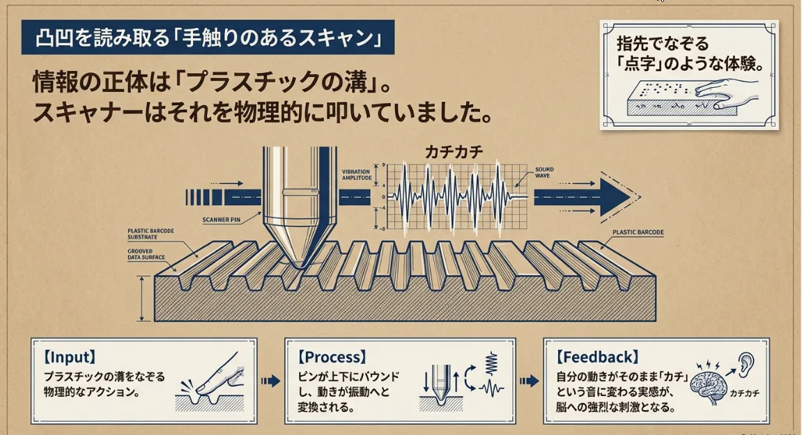 スキャナーを溝の上で滑らせると、先端にある小さなピン(針)が凸凹に当たって上下に動きます。この動きが内部のスイッチをカチカチと叩き、その回数や間隔を読み取って数字や音に変換していました。子供がゆっくり動かせばゆっくりとした反応が返り、速く動かせば速い音が鳴る。この「操作の加減による変化」は、まさに物理法則そのものです。
