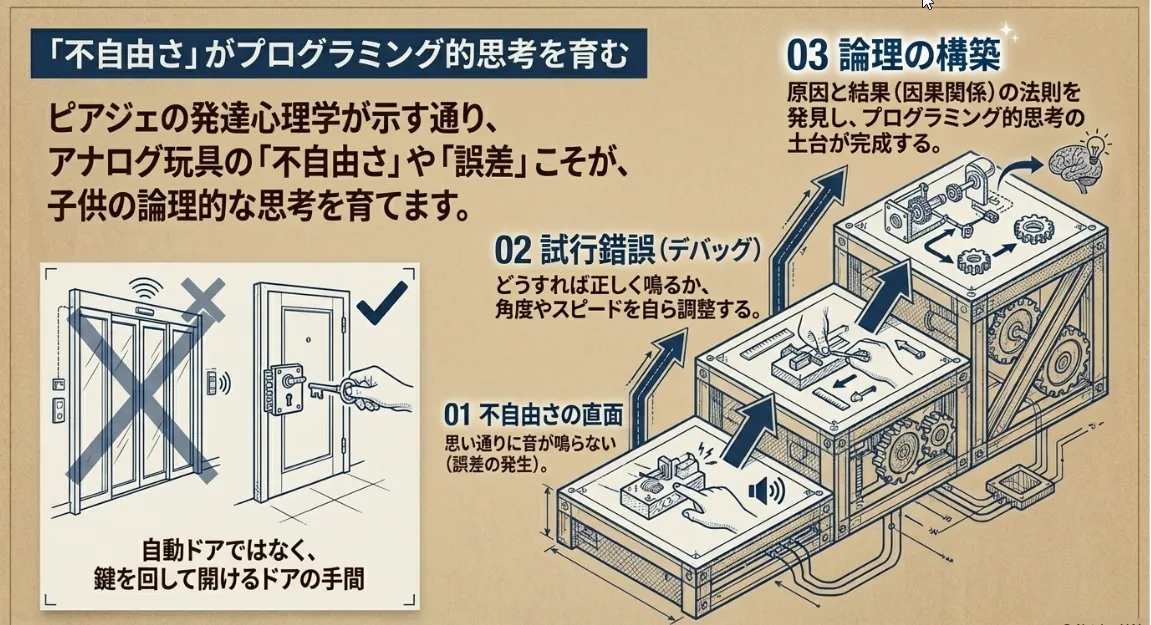 スイスの心理学者ジャン・ピアジェは、子供が環境と物理的に関わることで知能を構築していくと説いています。80年代のスキャナーのように、「一定の速度でこすらないと反応しない」「溝にしっかり当てないと音がかすれる」といったアナログな「誤差」は、子供にとって最高の思考材料になります。「どうすれば正しく動くかな?」という試行錯誤(デバッグ作業)を遊びの中で繰り返すことで、現代の教育で重視される論理的な組み立て力が自然と養われると考えられているのです。