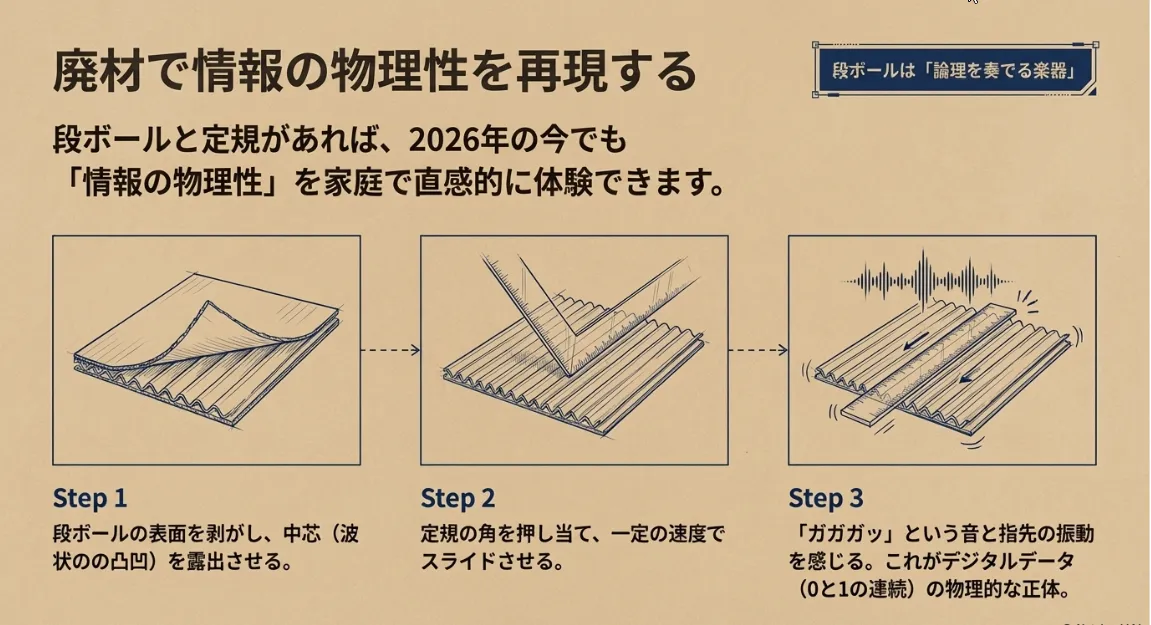 用意するのは、段ボールの切れ端と定規だけです。段ボールの表面を一枚剥がすと出てくる「波状の芯(中芯)」をバーコードに見立てます。このデコボコの上を定規の先端で勢いよく滑らせてみてください。「ガガガガッ!」という小気味よい振動と音が手に伝わりますよね。実はこれが、80年代のスキャナーが中でやっていたことの正体なんです。