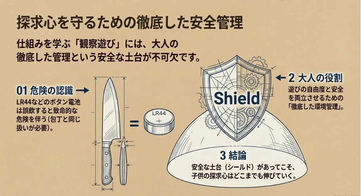 おもちゃの電池が切れたとき、すぐに交換して終わりにするのはもったいないですよ。私はあえて、電池を抜いた状態で子供と一緒に中を観察することをおすすめしています。「ここを押すとこのパーツが動くね」「この線がスピーカーに繋がっているんだ」という発見は、ブラックボックス化した現代社会に風穴を開ける、最高の理科の授業になります。