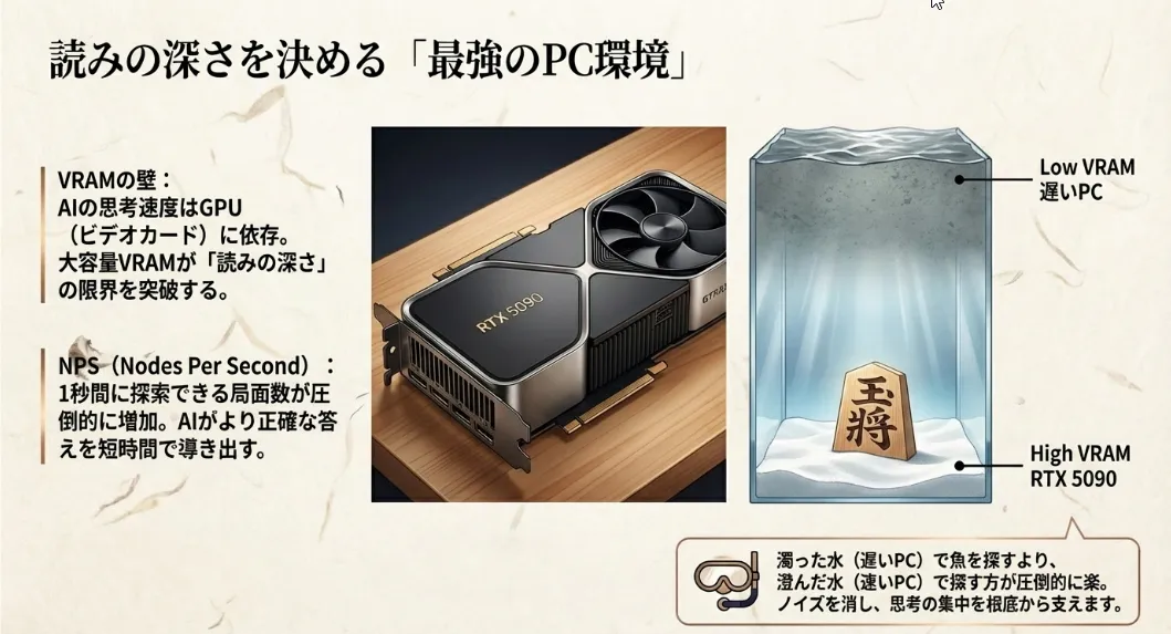 2025年から2026年にかけての標準スペックでは、ビデオメモリ(VRAM)が非常に重要視されています。1秒間に調べられる局面数(NPS)が多ければ多いほど、AIはより正確な答えを短時間で出してくれるからです。研究効率を追求するなら、以下のようなバランスの取れた構成が理想的とされています。