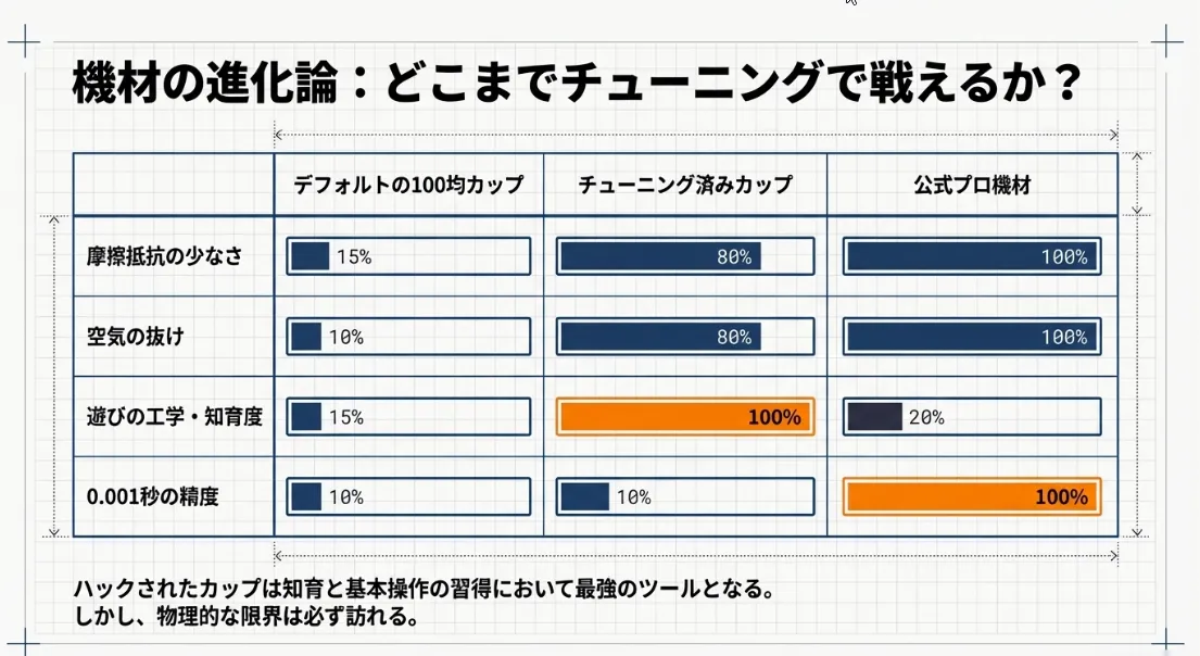 この表からもわかる通り、100均カップが遅いのは「品質が悪い」からではなく、そもそも「高速で動かす設計になっていない」だけなのです。逆に言えば、この「摩擦」と「空気」の問題を物理的にクリアしてあげれば、100均素材でも驚くほどのスライディング性能を手に入れることができます。