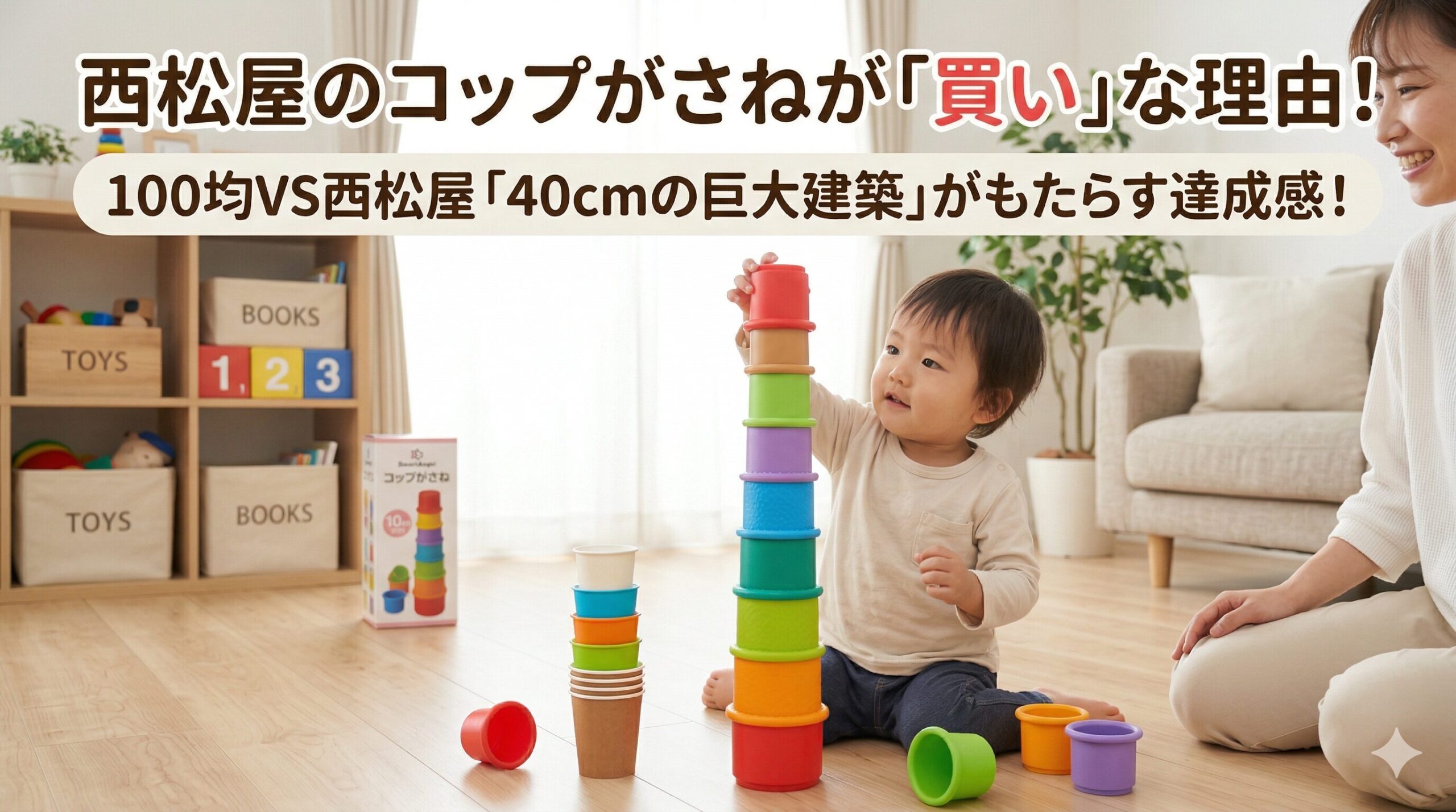 垂直に高く積むフェーズでは、カップの『安定感』が達成感を左右します。軽い100均カップだと、わずかな震えで崩れてしまい、お子さんが「もう嫌だ!」と投げ出してしまうことも…。そんな時、西松屋のカップの『重み』がどれほど救いになるか、物理的な視点で検証しています。