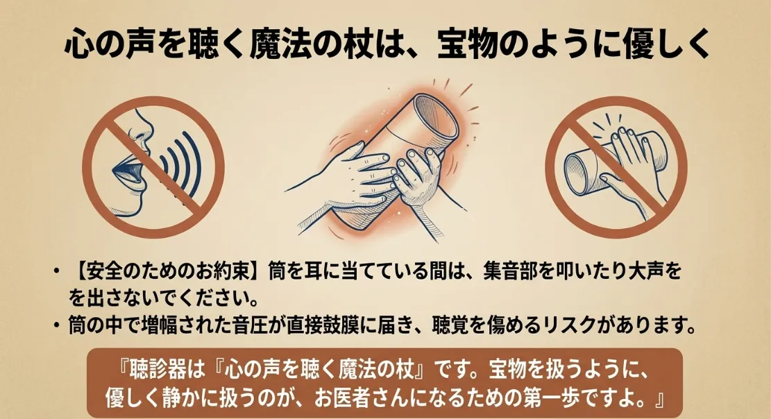 「音が大きく聞こえる」ということは、それだけエネルギーが集中しているということでもあります。私は子供たちに「お耳の細胞さんはとっても繊細だから、優しく聴こうね」と話しています。道具を大切に、優しく扱うマナーを教えることも、お医者さんごっこを通じた立派な教育になりますね。
