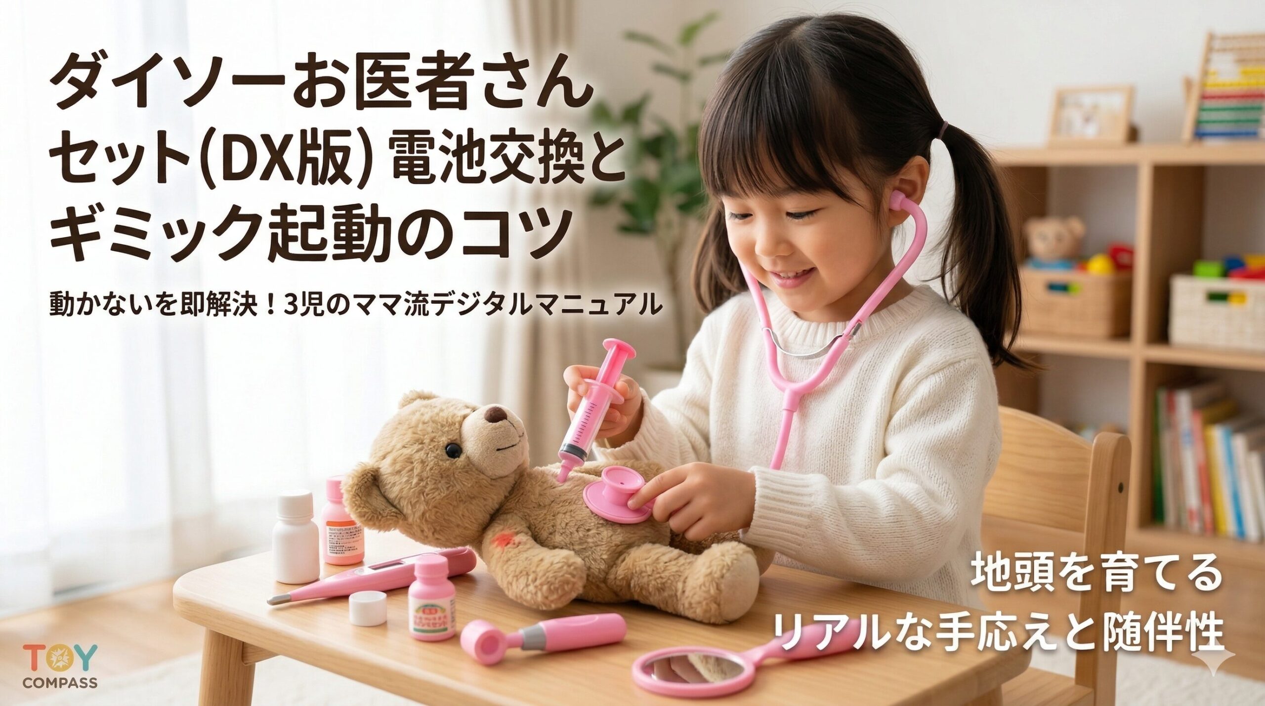 Amazonで本格的なツールを選ぶのも素敵ですが、「まずは手軽に100均から」というママも多いはず。特にダイソーのピンクのお医者さんセットはコスパ最強ですが、実は電池交換やギミックを動かすのに少しコツがいるんです。購入前にこの記事をチェックしておけば、お子さんの『動かない!』という涙を未然に防げますよ。