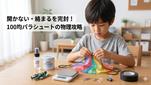 100均のパラシュートおもちゃが「開かない」「すぐ絡まる」と悩んでいませんか?2026年最新の物理ハックを3児の母が伝授!静電気を殺す裏技や、滞空時間を伸ばす重り調整、紐が絡まない8の字巻きまで。パラシュートおもちゃ100均製品を遊び尽くすための工学的な解決策をプロの視点で徹底解説します。