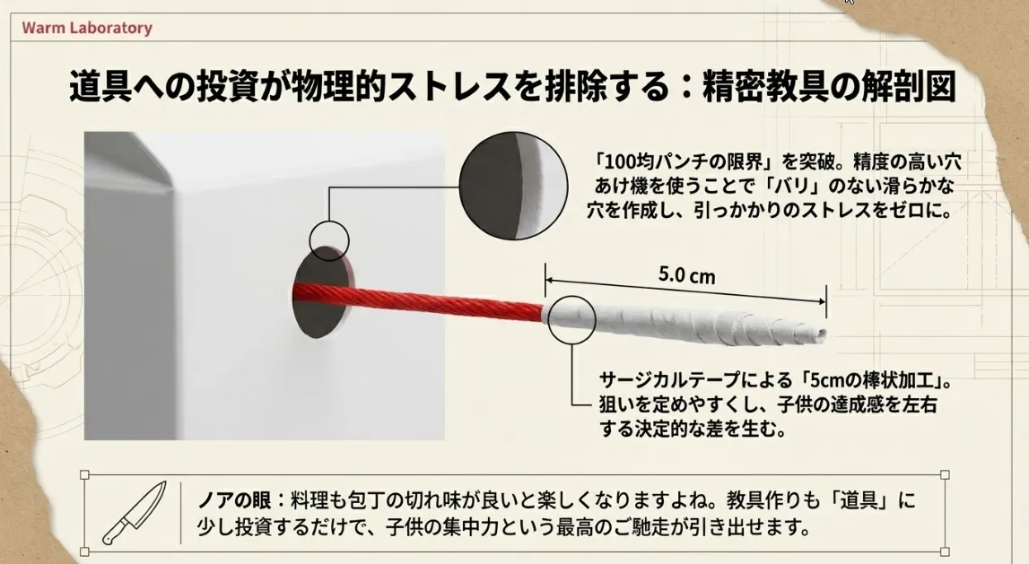 大切なのは、単に「穴に紐を通す」ことではありません。素材の「滑りやすさ(摩擦)」と「穴のサイズ」を、お子さんの成長に合わせてミリ単位で調整すること。この「物理的な変数のコントロール」こそが、2026年最新の知育戦略において、自律して学ぶ力を育てる最短ルートと考えられています。