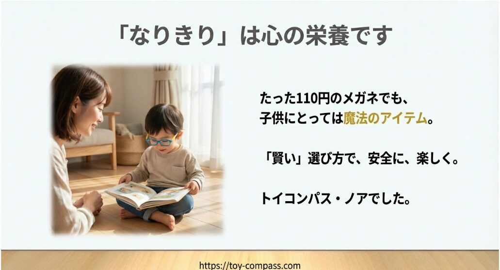 高3になった今の彼はもうおもちゃのメガネは掛けませんが、あの時育んだ「なりきり」の想像力は、今の彼の優しさや創造力に繋がっていると信じています。今、目の前でメガネを掛けて笑っているお子さんのその笑顔も、いつかかけがえのない思い出になります。安全に気を配りつつ、どうぞ親子で最高の「変身タイム」を楽しんでくださいね。トイコンパスは、そんなあなたの育児をいつも応援しています!