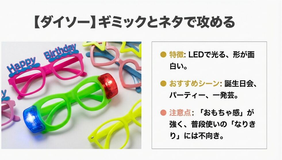 - イベントでの盛り上げ役なら:ダイソーの光るメガネ