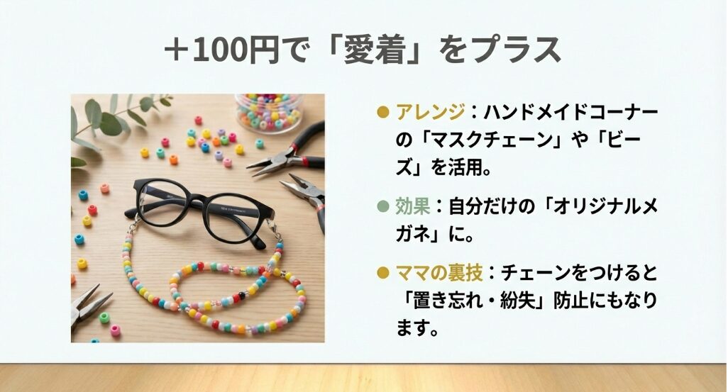 100均のハンドメイドコーナーにあるカラーワイヤーやモールを使えば、オリジナルのメガネフレームが作れます。これならサイズもお子さんの顔にぴったり合わせられますし、何より「ママと一緒に作った」という経験が、おもちゃ以上の価値になりますよ。