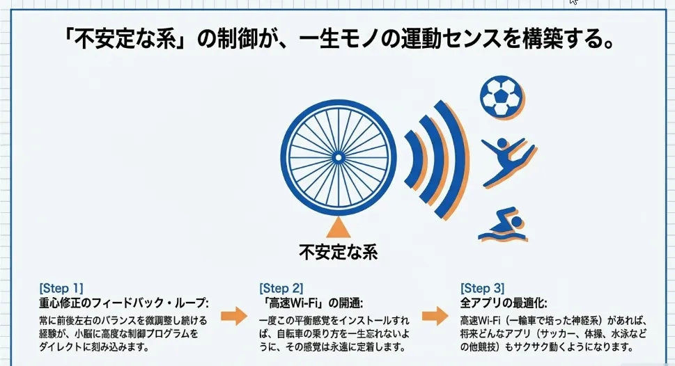 一輪車に乗っている時、脳内では驚くほど高度な演算が行われています。前後左右に倒れようとする力を瞬時に察知し、それを立て直すための命令を体中に送る……。この複雑な「フィードバックの繰り返し」が、神経回路を網羅的に構築していくのです。