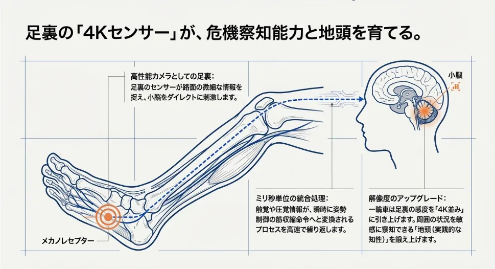 一輪車に乗るという行為を少し詳しく見ていくと、実は「足の裏」が決定的な役割を担っています。人間はバランスを保つとき、足の裏にある精密なセンサー(メカノレセプター)で路面の状態やペダルの反動を感じ取っています。