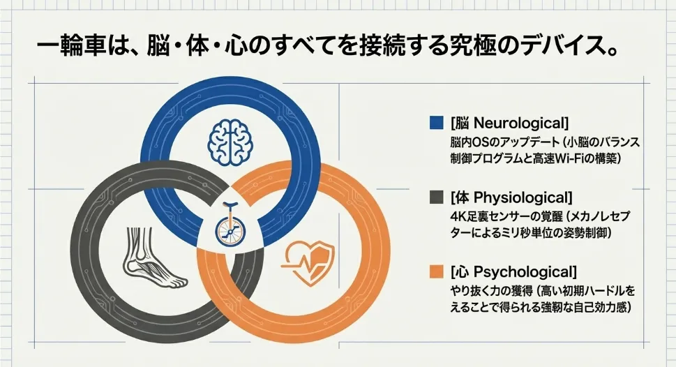 一輪車の練習を通じて得られるのは、単に「一輪車に乗れる技術」だけではありません。プレ・ゴールデンエイジという文脈において、一輪車は身体を自在に操るための「脳のOS(基本ソフト)」をインストールする役割を果たしてくれます。