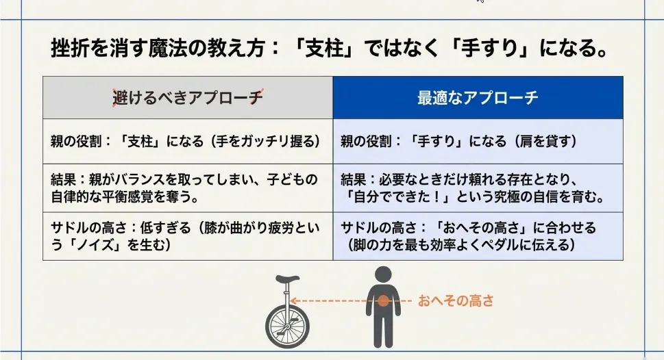 また、補助をする際に「子供の手を握る」のは控えましょう。手を握るとお子さんは親の腕を支柱にしてしまい、自分自身の平衡感覚を使わなくなってしまいます。おすすめは、大人の肩や腕を、お子さんが上から軽く押さえる形です。これにより、「自分のバランスが崩れたときだけ補助を借りる」という自律的な学習を促すことができます。