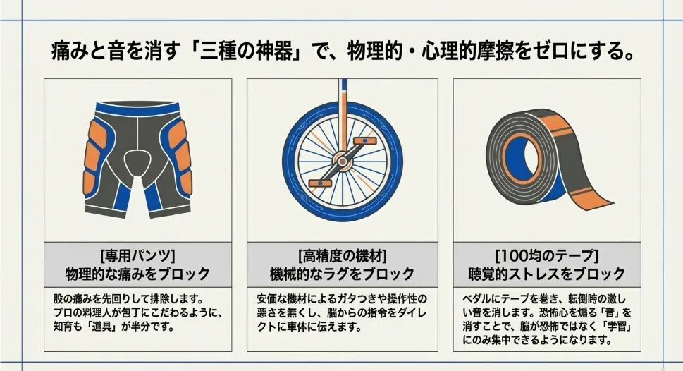 お子さんのやる気を削ぐ最大の敵は「痛み」と「周囲への気兼ね」です。プレ・ゴールデンエイジの皮膚は薄く、少しの練習でも股ズレを起こしやすいもの。「痛いからやめる」となる前に、物理的な対策を施しましょう。また、一輪車が倒れる際の「ガチャン!」という金属音は、お子さんに恐怖心を与えるだけでなく、近隣への騒音トラブルにもなりかねません。サドルの先端に厚手のクッションテープを巻くなど、消音対策をすることで心理的なハードルを劇的に下げることができます。