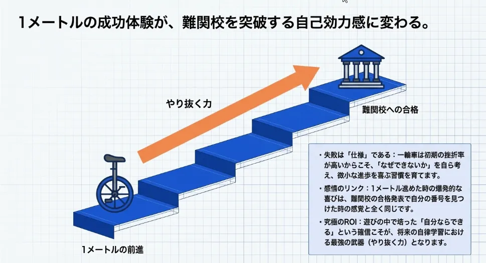 「今日は昨日よりタイヤを半分多く回せたね」といった、目に見えにくい小さな進歩を一緒に喜んであげてください。この成功体験の積み重ねは、単なる運動能力の向上にとどまらず、学習面での粘り強さや自己効力感の土台を築くことにも寄与するでしょう。私の経験上、こうした遊びを通じた試行錯誤の習慣は、将来の難関校合格を目指すような高度な自律学習の根っこになります。