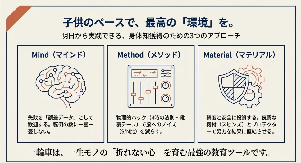 一輪車には転倒や痛みがつきものですが、これを「不快なノイズ」として放置すると、子供のやり抜く力(グリット)は削られてしまいます。これらを「成長のための必要なプロセス」として正しく管理していきましょう。