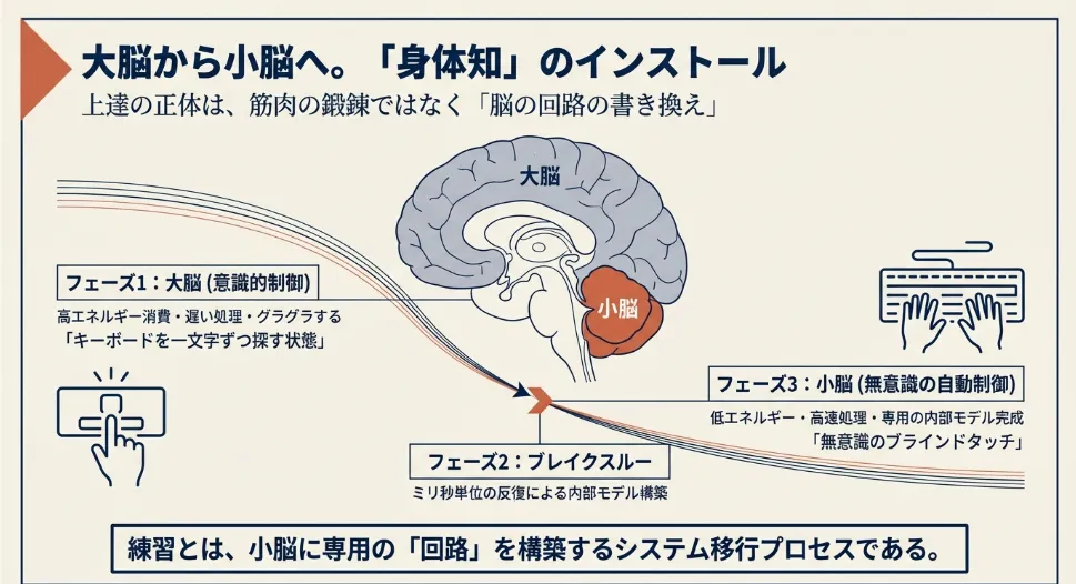 練習を始めたばかりの子供の脳は「大脳」がフル回転して、「次は右に倒れそうだから左に力を入れて…」と必死に考えています。しかし、この意識的なコントロールには限界があります。ある瞬間、練習の繰り返しによって主導権が「小脳」へと移ると、脳の中に「一輪車専用の自動運転プログラム(内部モデル)」が構築されます。これが、いわゆる「コツを掴んだ」状態です。